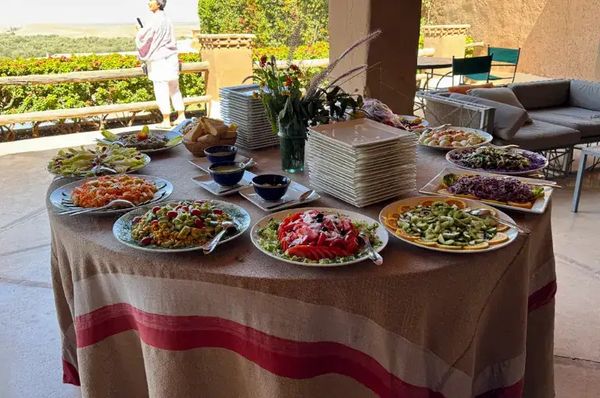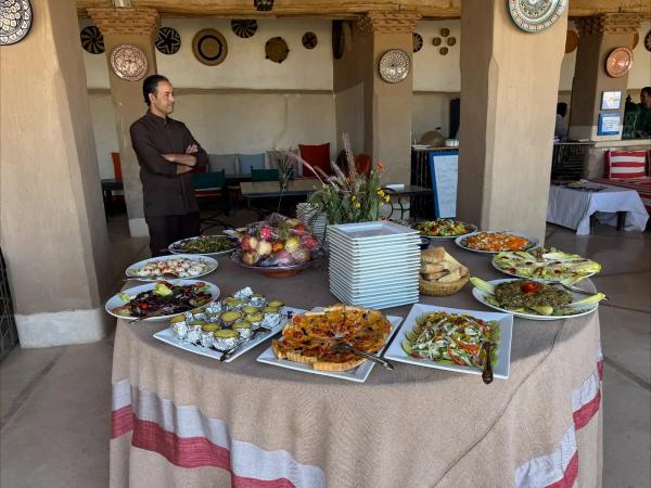 The food at Tigmi is one of its quiet highlights. Meals are prepared fresh each day, drawing on Morocco's extraordinary culinary heritage: vibrant salads, slow-cooked tagines, and three-course dinners eaten outdoors as the temperature softens in the evening.