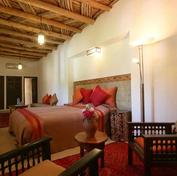 Tigmi's twenty rooms are built in the traditional Berber style, with warm terracotta walls, handcrafted furnishings, and a quiet that feels genuinely restorative. Each room is ensuite and equipped with air conditioning, a safe, a hairdryer, and bathrobes, with a nightly turndown service.